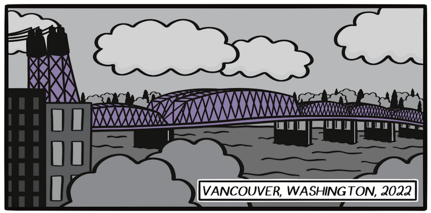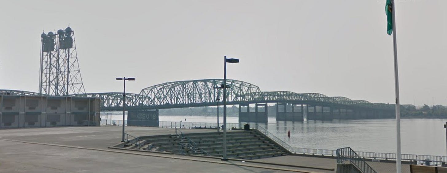 This is where I’ve lived since I was 25, and where the final chapter of the book takes place. This is the Interstate Bridge as seen from Vancouver’s Waterfront Park. My rendering is dated, but so is the Google Maps image, because as locals well know, this area is being developed a lot.