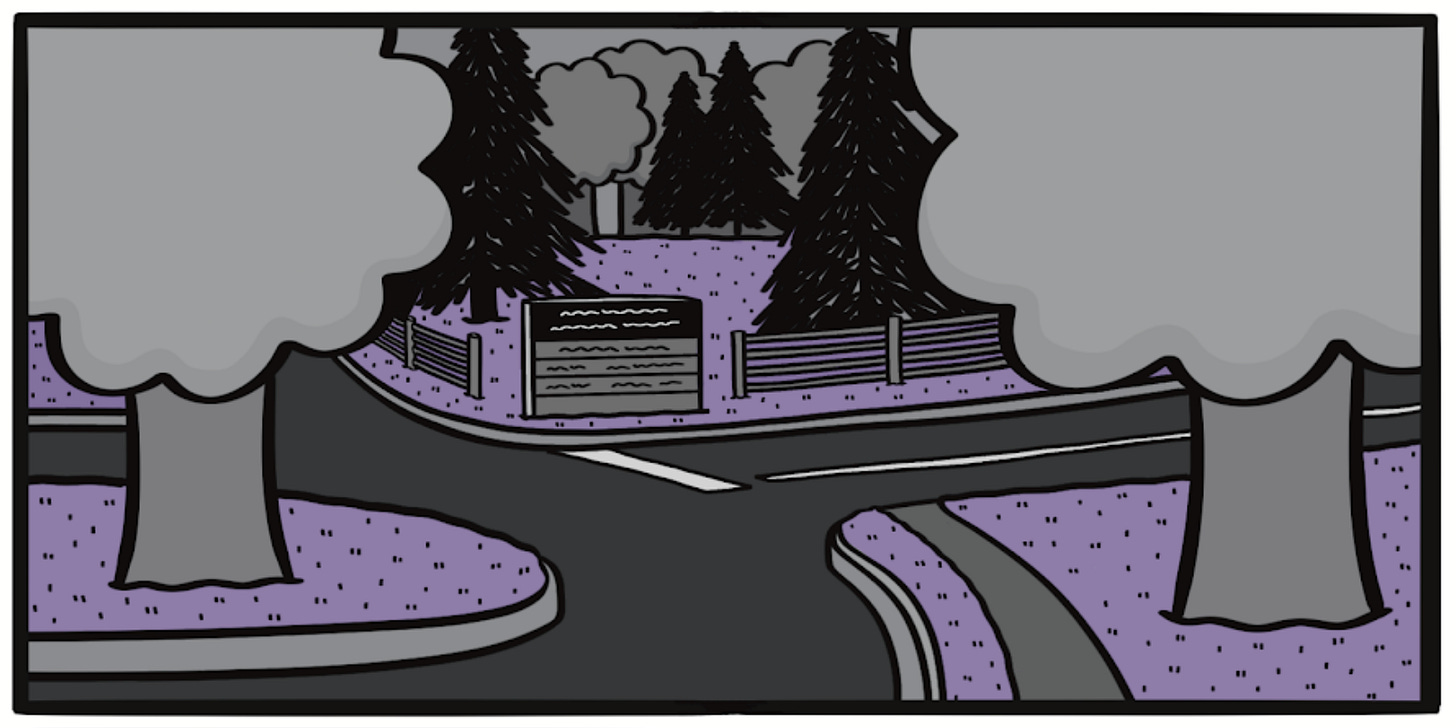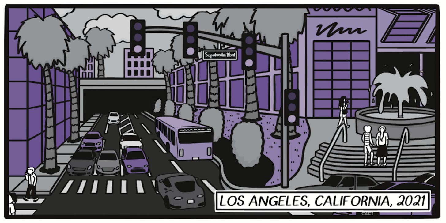 One chapter of the book takes place here, during the me and Eric’s 3-year stint in a massive city neither of us liked very much. We lived in walking distance to the very busy intersection of Ventura Blvd and Sepulveda Blvd, and here is my loose rendering of it.