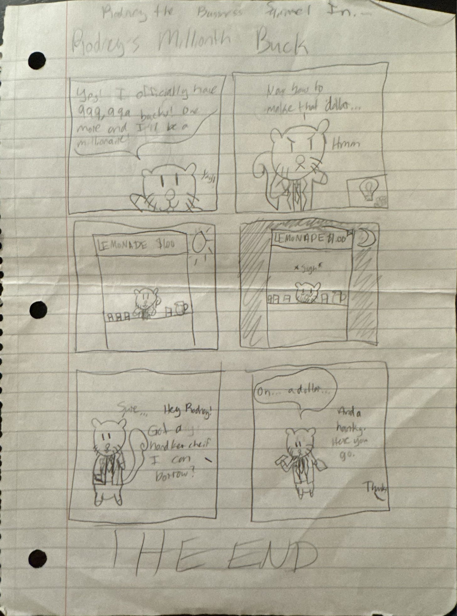 The below strip is an excellent example of this. As it was also drawn poorly on notebook paper more than 15 years ago, I will summarize once again: Rodney tries to make his “millionth buck,” so he opens up a lemonade stand. It is unsuccessful; the day goes by without a single customer. But have no fear: Rodney later reaches into his coat pocket and finds a dollar.