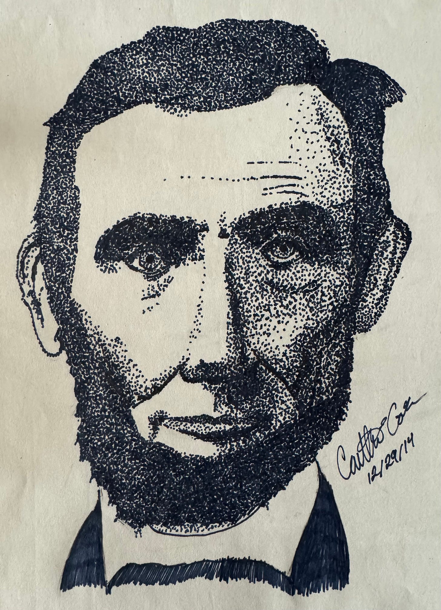 In high school, as I took art classes that focused on still lifes, my art became more based in realism. I also took a great interest in my American history classes, taking APUSH and being way too serious about my senior year civics class. In my own free time, without it being assigned to me, I made this pointillism portrait of one of my country’s most iconic presidents.