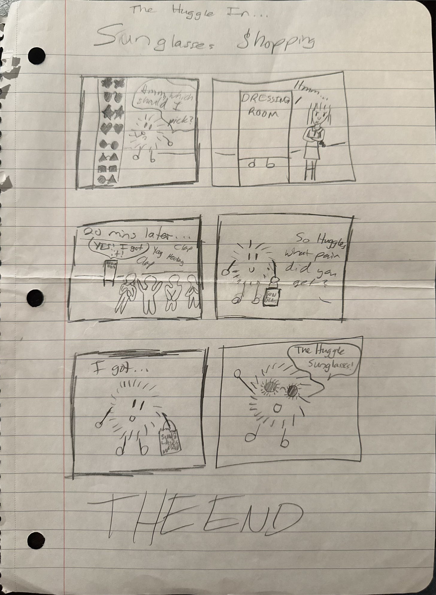 In this strip, Huggle shops for a pair of sunglasses. Since it was drawn poorly in pencil on notebook paper around 15 years ago, it’s a little hard to read, but essentially Huggle ends up buying a pair of sunglasses that are modeled after himself.