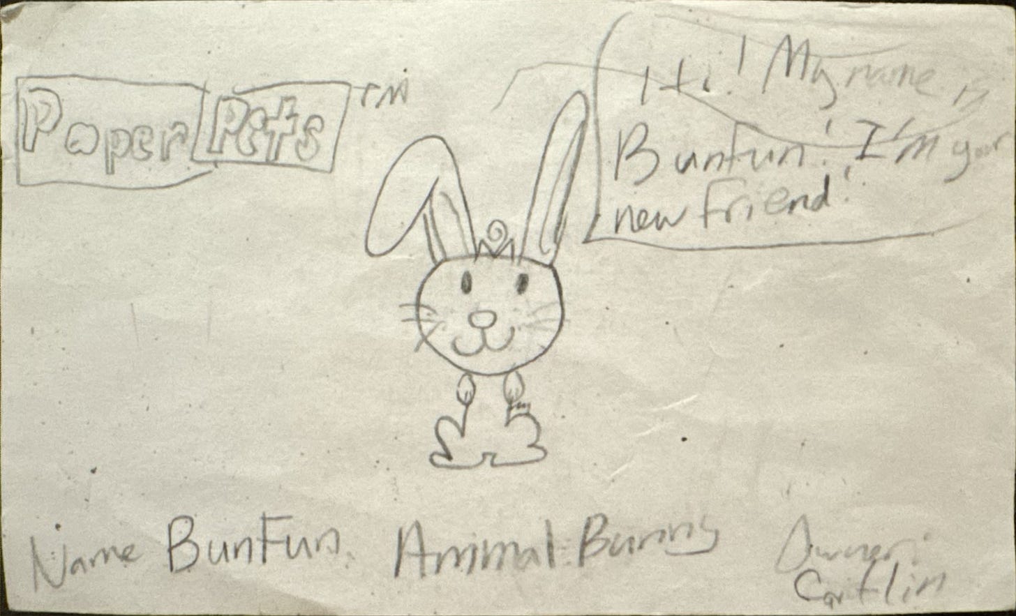 In fifth grade, my friends and I used to take index cards, draw little animals on them, and trade them like like baseball cards. We called them Paper Pets™ (and we made sure to include the trademark symbol). To my knowledge, this Paper Pet™ named “BunFun” that I found in a pile of stuff at my parents’ house is the only surviving Paper Pet™!