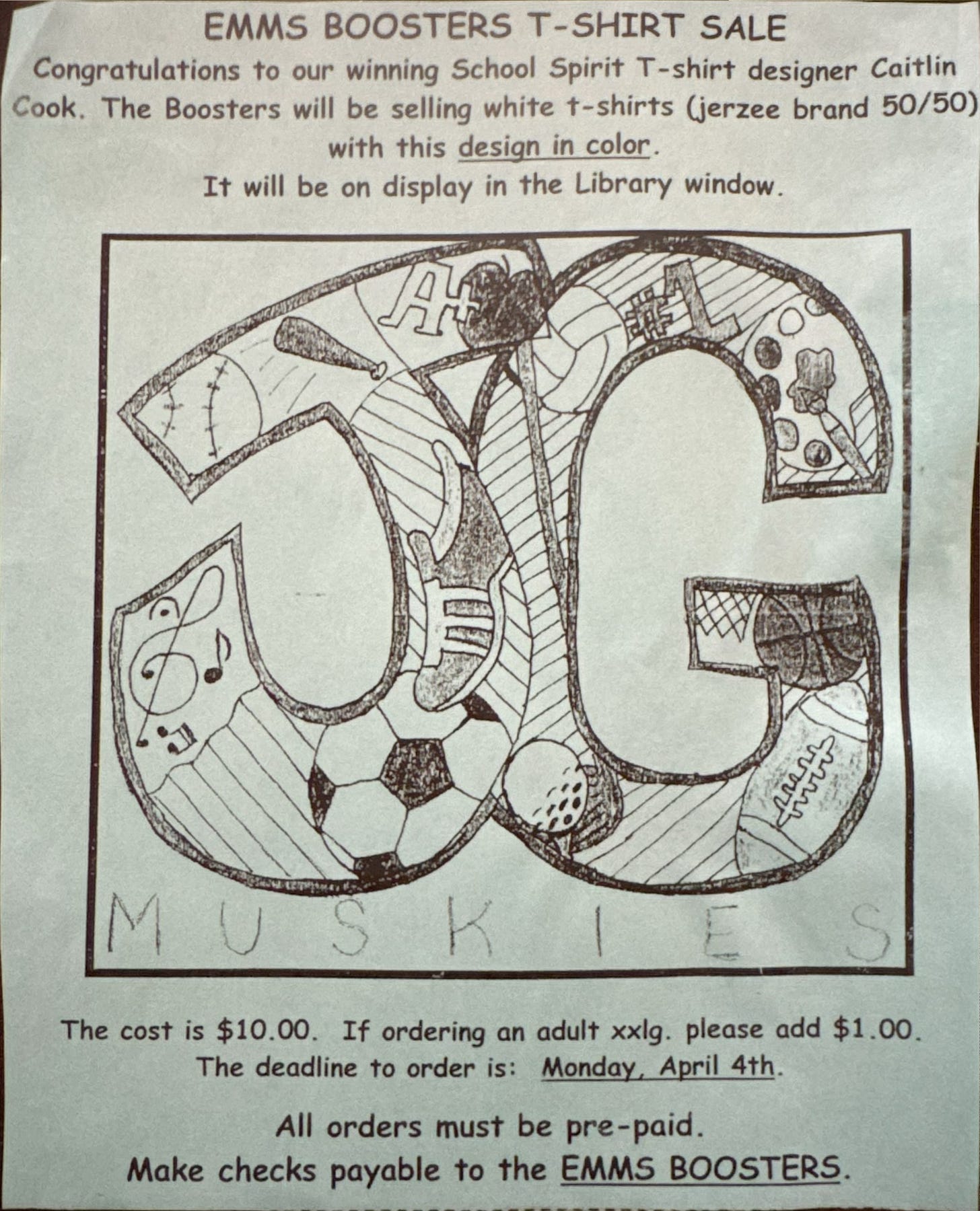 And what do you know — I did win! And it meant the whole world to me! My design was printed onto a bunch of t-shirts and sold to raise money for the school. Below is the sheet that was handed out for people to place their orders.